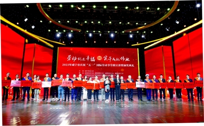 4月27日晚,我市隆重举行庆祝“五一”国际劳动节劳模宣讲暨颁奖典礼活动,为2023年咸宁市五一劳动奖章、奖状、工人先锋号的获奖集体和个人授牌颁奖, 激励全市广大职工群众大力弘扬劳模精神、劳动精神、工匠精神,立足岗位、开拓创新,努力为建设武汉都市圈自然生态公园城市作出新的更大贡献。 咸宁日报全媒体记者 夏正锋 摄