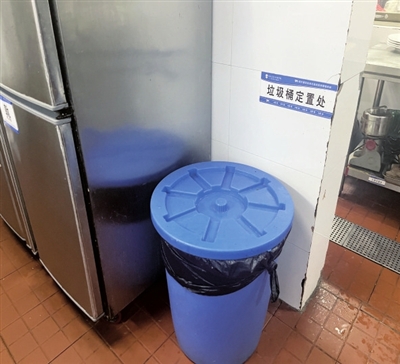 虽然里面的人个个忙碌,却没有一个人乱扔乱倒。对于产生的餐厨垃圾,都仔细收集好,放入套着塑料垃圾袋的垃圾箱里。