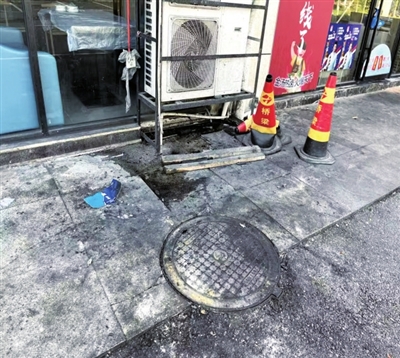 一家店铺外的空调外机旁,污水和油污混合在一起,里面散落着碳渣,将路面染得黑黑的,附近的井盖也被油污覆盖,已看不出原本的颜色。