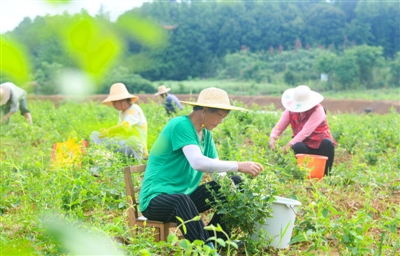 5月5日,咸安区双溪桥镇毛祠村金银花种植基地,当地村民忙着采摘金银花花骨朵。