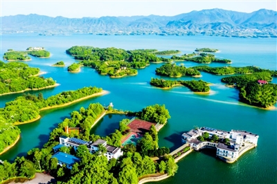 57平方公里水域面积上,湖中800多个岛屿星罗棋布。湖中水质澄明碧透,水上碧波荡漾,鱼舟轻发,快艇如织,是避暑休闲、旅游度假、康复疗养及水上运动的理想之地。