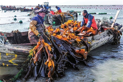 近日,在山东省荣成市俚岛镇海带养殖区,渔民们在海上采收海带,该地海带年产量43万吨,其中盐渍海带近26万吨。 (本报综合)