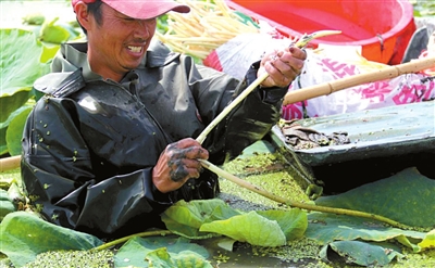 “每年的5月到9月是采摘藕带的最好时节,我们一般早上5点就开始采摘,平均每人每天能采摘藕带七、八十斤左右。”采摘工人鲁师傅说。