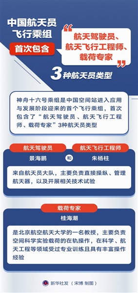 据新华社酒泉5月29日电 神舟十六号航天员乘组名单5月29日上午公布,中国第三批航天员朱杨柱、桂海潮入选,这也是中国第三批航天员首次执行载人航天飞行任务。