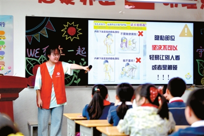 5月26日,市实验外国语学校201班教室,来自湖科“WE爱在一起”团队志愿者正给学生们讲解生活中如何保护自己。