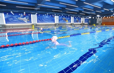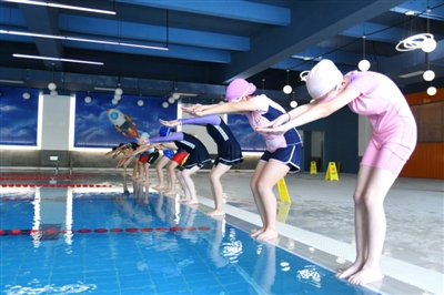 5月12日,华中师范大学附属赤壁学校室内游泳馆内,学生正在练习游泳。