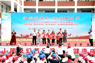 随后,梁薇、夏文强为新少先队员佩戴红领巾。活动宣布了2022年崇阳县新时代好少年表彰名单、第四届“崇阳县最美家庭”和2020-2022年县级文明校园名单。