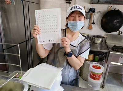 “这是5月30日,一个熟识的高三学生亲手写了送给我的。”将手上的水在围裙上擦了又擦之后,黄亚琼从一旁的柜子里拿出了一张纸,笑得合不拢嘴。