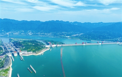 6月10日,船舶有序通过三峡双线五级船闸(无人机照片)。