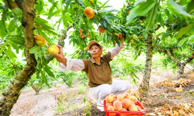 6月11日,嘉鱼县新街镇嘉多宝生态果蔬专业合作社里,黄里透红早熟黄桃压弯了枝头,游客络绎不绝。