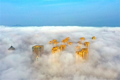 近日,山东省日照市东港区沿海出现平流雾景观,从海上飘来的雾气飘飘渺渺,上空俯瞰海滨城市宛如仙境。