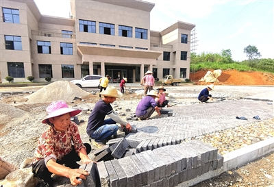 6月6日,通山县大畈镇隐水村,当地村民们在该村农民工活动中心广场铺设地砖。