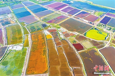 近日,山西省运城市七彩盐湖呈现出色彩斑斓的景观,美不胜收。