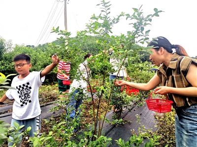“墨蓝色的蓝莓汁多味甜,又红又香的蟠桃、黄桃任你摘,新鲜的辣椒、茄子供君选,累了有可口的农家饭,困了可宿鹭栖客栈……”