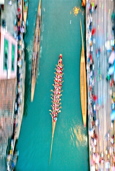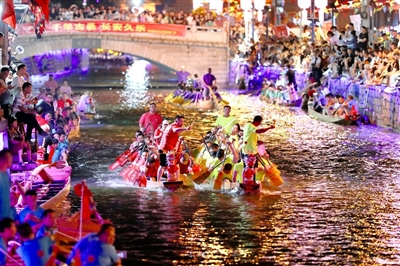 端午来临,福建省福州市长乐区三溪村独有的龙舟夜渡迎端午活动如约而至。夜幕降临,华灯初上,随着鼓声响起,数十条龙舟陆续出现在古村的小溪中,清澈的水面上船桨翻飞、龙舟飞驰,夹岸观众人头攒动,加油呐喊不绝于耳,一派热闹景象。夜赛龙舟习俗在三溪村已经沿袭600多年,每年端午节前后,村里的男女老少都会相聚一起夜竞龙舟,借此祈盼风调雨顺、平安健康。 据新华社