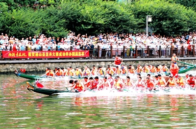 ③ 6月22日上午,龙舟竞渡活动在通山县通羊河举行,河面上水花四溅鼓声阵阵,竞渡龙舟如离弦之箭劈波斩浪疾速前进,两岸观众激情呐喊加油助威。 唐成 摄(影像咸宁)