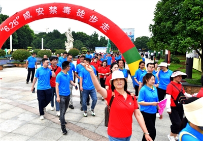 上图:6月20日,咸安区嫦娥广场,咸安区禁毒委和区公安分局联合举办“6.26”健康徒步走全民禁毒行宣传教育活动。