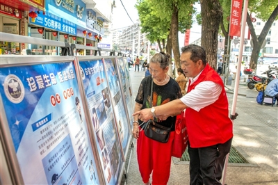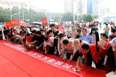 右上:6月21日,市公安局温泉分局联合温泉街道、咸宁市强戒所在万达广场开展全民禁毒宣传活动,参与活动的居民踊跃在禁毒宣传横幅上签名。
