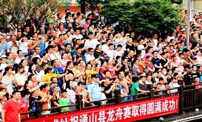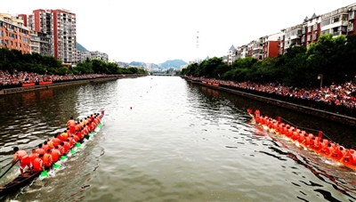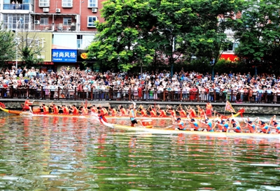 河面上水花四溅鼓声阵阵,竞渡龙舟如离弦之箭劈波斩浪疾速前进,一河两岸三万群众激情呐喊加油助威,现场一片欢腾。