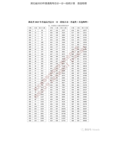 湖北省2023年普通高考总分一分一段统计表——普通类(首选物理)