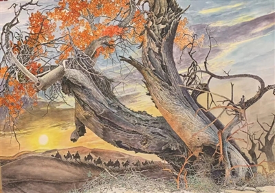 一张完整的画仅有枫杨还不够,还要画出周边生存环境。红花还要绿叶配,有主角还要有配角,这样的艺术才是真实,画面才能丰满,结构才算完整。毛才奇老师的枫杨从来不是孤立存在,或长在蓝天下,或站在高坡上,或依在村庄旁,或立在潺水边,炊烟、水牛、顽童、水鸭等生活元素点缀其中,画面高远,意境深邃。