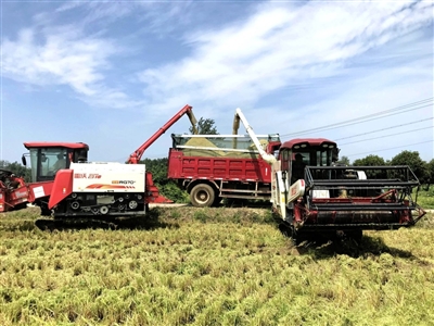 随着收割机“轰隆隆”的作业声,收割、脱粒、粉碎稻草一气呵成,金灿灿的稻谷从收割机铁臂下“哗哗哗”地卸到车厢内,大片大片等待收割的金黄色稻谷,在阳光的照耀下散发出阵阵稻香。