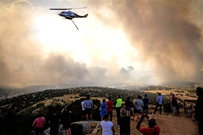 近日,希腊首都雅典北部、西部和东南部多个城镇发生野火,至少6个海滨社区收到疏散令,上千人被迫撤离。目前雅典东南部城镇部分火情已得到控制,但北部野火由于发生在原始森林,加之强风天气影响,火势控制较为困难。 (本报综合)