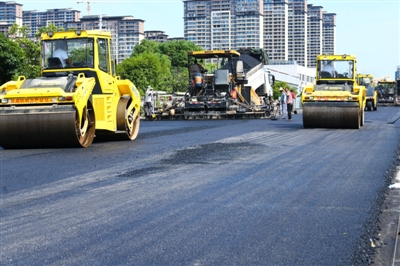 7月13日,市交通实验幼儿园二园配套市政道路项目建设现场,市城发集团兴达路桥公司公路养护事业部员工冒着高温进行路面沥青摊铺,为幼儿园9月开学做好配套服务工作。