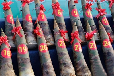 近日,在广西柳州市柳城县沙埔镇,27个大如炮弹的竹笋摆放在广场中央,吸引大批民众前往围观。当日,该镇举办“笋王”争霸比赛,评委根据长度、直径、成色、重量等标准评选出最终“笋王”。
