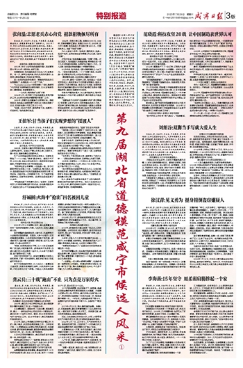 编者按:为深入学习宣传贯彻习近平新时代中国特色社会主义思想,积极培育和践行社会主义核心价值观,弘扬劳动精神、奋斗精神、奉献精神、创造精神、勤俭节约精神,培育时代新风貌,塑造新时代湖北人文精神,促进全省公民道德素质和社会文明程度不断提高。省委宣传部于2023年7月20日起在“荆楚网”微信公众号、“文明湖北”微信公众号上开设专栏,对193人(组)符合第九届湖北省道德模范推荐标准的候选人进行公众评议。其中,我市张向温、刘细谷、舒诚树、徐汉青、龙运娥、郑卫平、范晓霞、王值军、龚云兵、李海燕等10人入选(排名不分先后),欢迎社会各界登录“荆楚网”微信公众号或“文明湖北”微信公众号对咸宁市候选人进行点赞评议。点赞时间:即日起至8月2日。