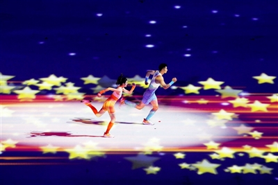 在主题曲《成就梦想》歌声中,道道金色光芒洒向地面,代表参赛国家和地区的旗帜汇聚于场地中央,寓意地球村的居民们沐浴在同一片阳光之下,以包容的胸怀构建和而不同的精神家园。
