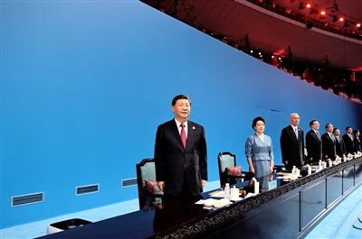 19时58分,在《和平——命运共同体》的乐曲声中,习近平和夫人彭丽媛,同国际大学生体育联合会代理主席艾德等步入主席台,向观众挥手致意。全场响起长时间的热烈掌声。