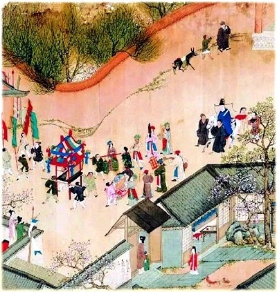明代画家余士和吴钺共同绘制的《琼林登第》图记录的是隆庆二年(1568)32岁的徐显卿金榜题名后跨马游街和赴琼林宴的热闹情景。图中徐显卿身穿进士服(深蓝罗衣,深青缘边,圆领大袖),头上戴着进士巾(与乌纱帽形制相近,左右展角,阔一寸余,长五寸余,垂有皂纱飘带,一对簪花,附有一对抹金银牌“恩荣宴”),手执用槐木制作的笏板。骑着一匹白马,踌躇满志,兴高采烈,两个黑衣皂隶为其牵马。前面一队仪仗,举着旌旗,抬着“进士及第”匾牌,吹奏着乐器,一片欢乐祥和的气氛。画面的右侧为沿街院落,女子们有的掩门,有的在墙内登高观看热闹的场景,投去艳羡的目光。画面的左上方一童子牵着一头毛驴,一个落第的举子(或正在准备应试的举子),投去的目光很复杂,或自惭形秽,或嫉妒,或羡慕,立志发奋读书,争取金榜题名,光耀门庭。