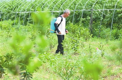 8月9日,嘉鱼县新街镇嘉多宝果园,工人在脐橙苗基地进行田间管理,防治病虫害,确保果苗持续向好生长。 记者 陈红菊 特约记者 龙钰 通讯员 梁宁 摄