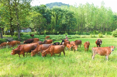 8月10日,赤壁市官塘驿镇龙凤山村,黄牛正悠然自得地吃着青草。该村养殖户利用林草资源发展猪、牛、羊养殖,走出一条增收致富路。 记者 陈红菊 特约记者 但唐静 摄