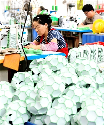 近日,位于咸安区巨宁大道的咸宁康隆体育用品有限公司生产车间,工人正在缝制足球模型。