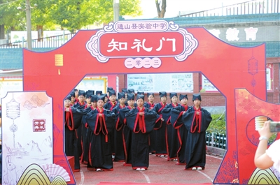 在通山县实验中学“请党放心 强国有我”开学典礼上,同学们着汉服、行古礼,走过知礼门,通过端正衣冠、行拜师礼、净手净心、击鼓明智,感受传统文化的魅力。
