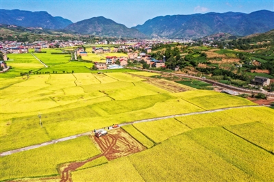 金秋时节,重庆市巫山县庙宇镇稻谷陆续进入成熟收割期,稻农们抢抓晴好天气,收割水稻。 (据新华社)