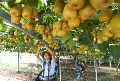 赤壁神山兴农科技公司猕猴桃西湾基地,一颗颗圆润饱满的猕猴桃挂满枝头,果农手脚麻利地采摘着猕猴桃。