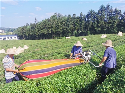 本报讯 记者丁伟、通讯员杜六甫报道:前者抬机器、后者牵布袋……18日,通城县三香茶业白马基地200亩茶园内,茶农们两三人一组相互协作,正忙着用机器采收夏秋茶。