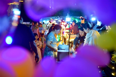 傍晚时分,华灯初上,到广场游玩的市民络绎不绝。一边是精彩纷呈的节目演出,让人们目不暇接、沉浸其中,一边是种类繁多的网红小吃,让人们垂涎欲滴、边逛边吃,整个广场升腾起浓浓的烟火气,成为市民和游客的欢乐天堂。