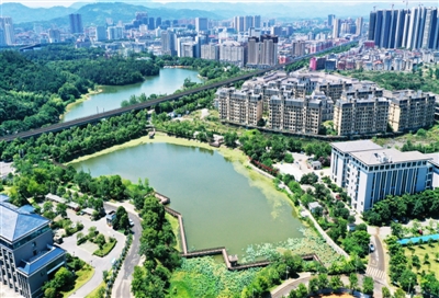 日前,无人机拍摄的温泉城区镜湖,绿树成荫,风景如画。近年来,我市积极改善镜湖生态环境,高标准对镜湖绿化设施进行管护和改造,吸引不少市民在此休闲娱乐,欣赏美景。