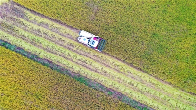 10月10日,咸安区马桥镇高赛村,大型收割机正在田间收割稻谷。据了解,该种植基地由咸安俊辉农场流转100余亩土地种植富硒稻谷,目前已进入成熟收割季,农场正抢抓好天气颗粒归仓,预计总产值可达15万余元。