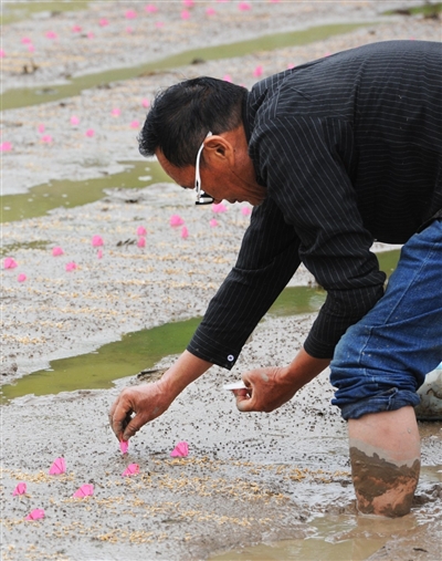 魁梧的身材、黝黑的脸庞、戴着草帽、弯着腰,将手里的水稻材料小心翼翼地撒在苗床上。