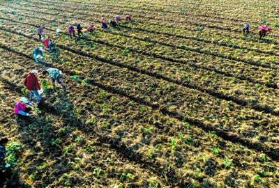 11月17日,咸宁向阳湖现代农业科技示范区,上百名工人在田块内移栽油菜秧苗。