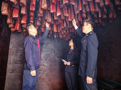 腊味,是冬季必不可少的美食。一条条腊肉挂在房梁上晃晃悠悠,松枝在慢燃中释放香味独到的烟雾,上千斤熏烤的腊肉、腊兔整整齐齐地挂在货架上,这是通山县税务局的干部在走访通山县长辉农产品有限公司加工车间时捕捉到的景象。