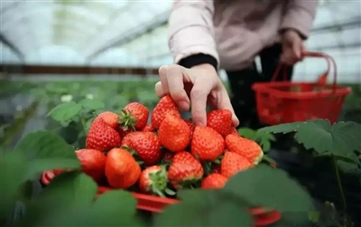穿梭在草莓丛间,找准枝条上颗粒饱满,鲜艳欲滴的草莓,小心翼翼地将它摘下,放进自己的篮筐里,随着篮筐里的草莓逐渐增多,采摘的成就感和丰收的喜悦感也油然而生。
