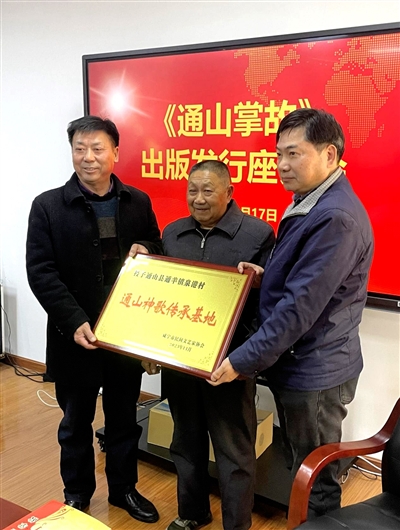 11月18日,咸宁市民间文艺家协会主席定光平将一块“通山神歌传承基地”的牌匾递到通山县通羊镇泉港村神歌歌师代表许扬旺、方名柱手上,意味着通山神歌基地正式成立。