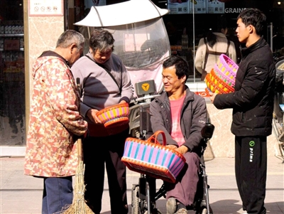 “他的花篮编得很不错,又好看又耐用,我一下买了三个。”邻居程大妈开心地说。