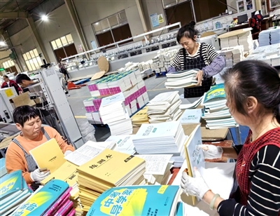 胶印车间内,机器飞速印刷,一张张图文并茂的教辅材料从机器里“吐出”;仓储中心,工作人员正在按订单收拣、分发图书;仓库里,一摞摞刚刚印刷好的书摆放整齐,形成了一座座小山丘;快递分拣线上,工人们快速而不慌乱地打包,传送带的另一头是一辆快递货柜车等待着接收包裹。